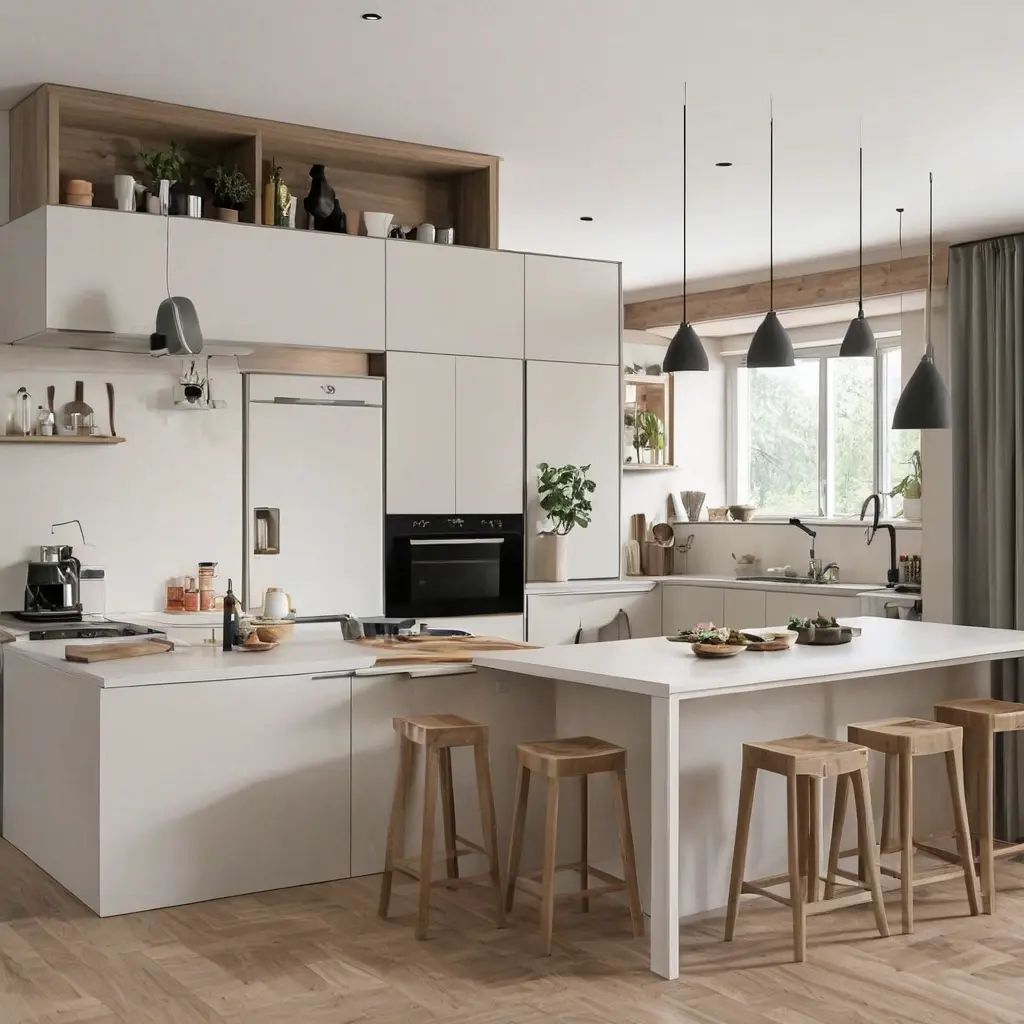 | Барная стойка | Использование стойки как разделителя между кухней и гостиной. | Компактно, дополнительное рабочее место и зона для быстрых перекусов. | Барная стойка с высокими стульями, рядом с кухонным гарнитуром. |