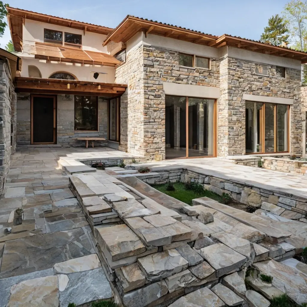 Разнообразие оттенков и текстур делает кварцит идеальным выбором для создания уникального архитектурного образа дома. Камень прекрасно сочетается как с современными, так и с классическими стилями.