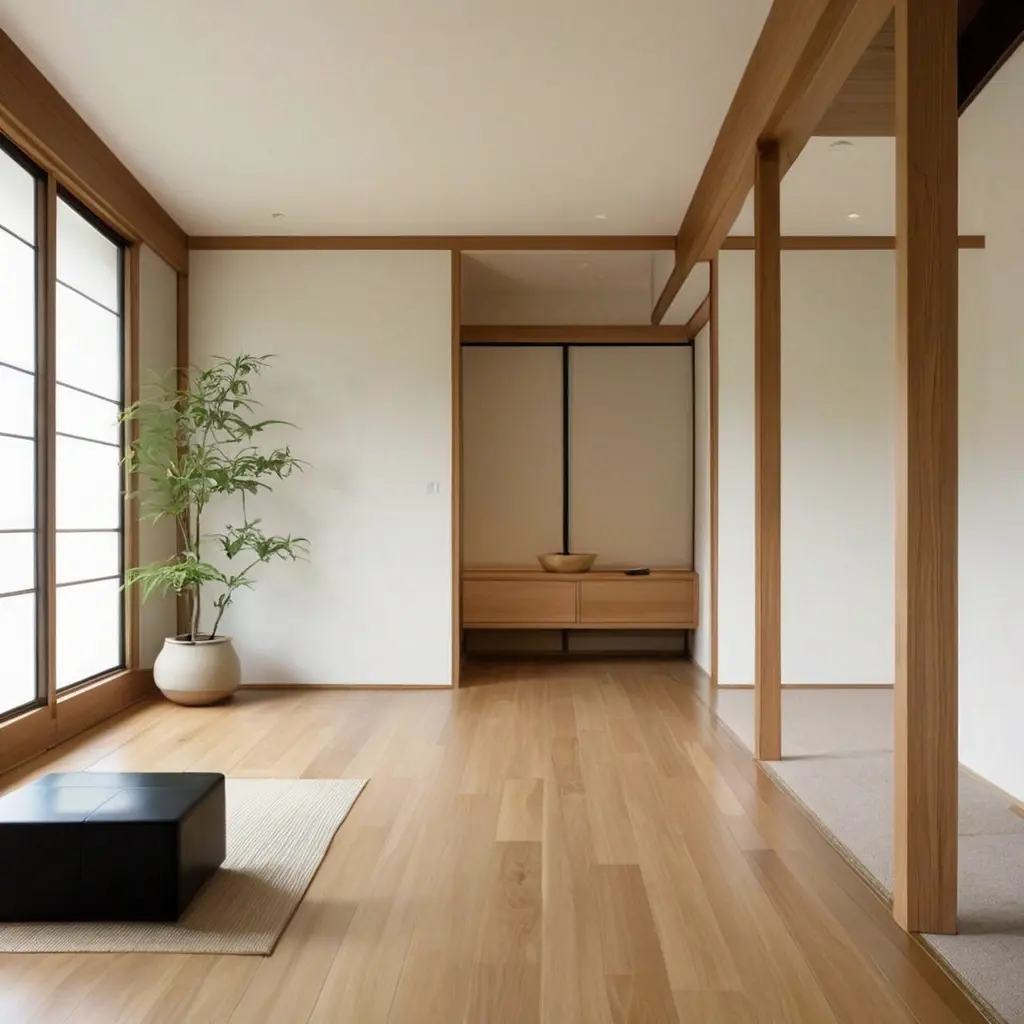 - Гостиная японского стиля: открытое пространство с татами и низким столом, стены украшены минималистичными каллиграфическими свитками и сёдзи-перегородками.